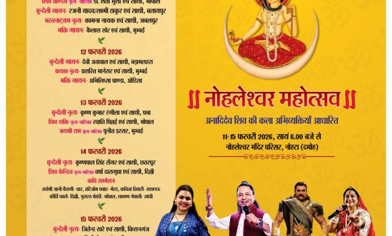 मध्यप्रदेश शासन, संस्कृति विभाग एवं जिला प्रशासन-दमोह के सहयोग से 11 से 15 फरवरी 2026 तक अनादिदेव शिव की कला अभिव्यक्तियों आधारित नोहलेश्वर महोत्सव का आयोजन सायं 06 बजे से नोहलेश्वर मंदिर परिसर, नोहटा (दमोह) में किया जा रहा है।