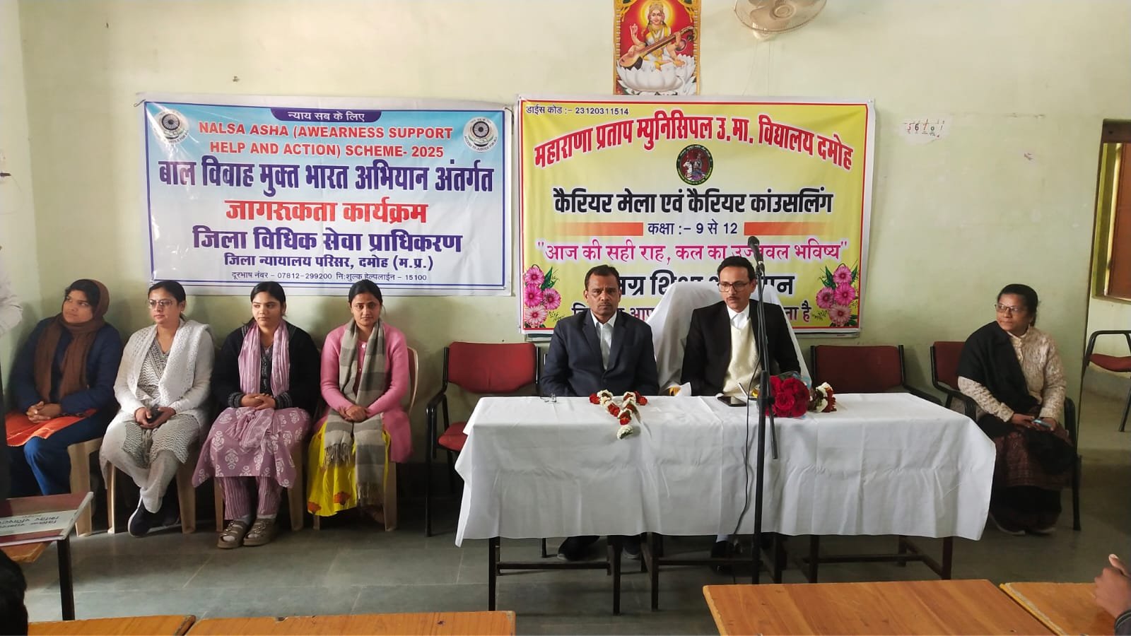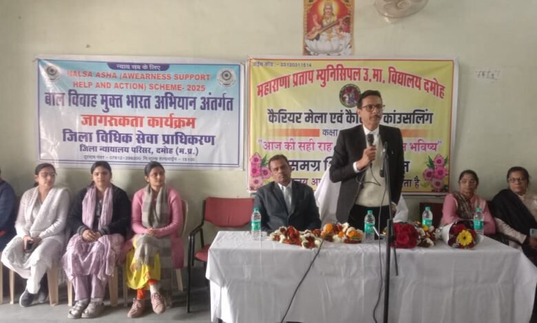 राष्ट्रीय विधिक सेवा प्राधिकरण नई दिल्ली के तत्वाधान में एवं म.प्र. राज्य विधिक सेवा प्राधिकरण जबलपुर के निर्देशानुसार एवं प्रिंसिपल जिला न्यायाधीश/अध्यक्ष सुभाष सोलंकी जिला विधिक सेवा प्राधिकरण दमोह के मार्गदर्शन में शासकीय महाराणा प्रताप उच्चतर माध्यमिक विद्यालय दमोह में विधिक जागरूकता कार्यक्रम का आयोजन किया गया। कार्यक्रम में जिला न्यायाधीश धर्मेश भट्ट, जिला विधिक सहायता अधिकारी रजनीश चौरसिया, प्राचार्य जितेन्द्र कुमार राय सहित समस्त शिक्षकगण तथा छात्रगण उपस्थित रहे।