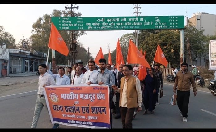 दमोह। मजदूरों एवं कर्मचारियों के विभिन्न समस्याओं को लेकर भारतीय मजदूर संघ दमोह द्वारा केंद्रीय आवाहन पर स्थानीय त्रिमूर्ति पार्क बेला तालाब में शाम को 4ः00 बजे महापुरुषों की मूर्ति पर माल्यार्पण कर धरने का शुभारंभ किया गया धरने के के साथ कलेक्टर के माध्यम से माननीय प्रधानमंत्री, माननीय केंद्रीय श्रम मंत्री माननीय मुख्यमंत्री मध्य प्रदेश शासन को 46 क्षेत्रीय मैंगो का ज्ञापन सोपा गया, बख्ताओं ने ज्ञापन को संबोधित करते हुए कहां केंद्र सरकार द्वारा लागू किए गए चार श्रम संहिताओं में से दो का भारतीय मजदूर संघ ने पूर्व में समर्थन किया था, लेकिन शेष दो संहिताओं में कमियां होने के कारण संशोधन की मांग की जा रही है, इस संबंध में केंद्रीय श्रम मंत्री से कई बार पत्राचार और बैठकों के माध्यम से चर्चा भी की गई परंतु अपेक्षित सुधार नहीं होने के कारण आज देशव्यापी धरना प्रदर्शन के माध्यम से सरकार का ध्यान आकर्षण के लिए धरना प्रदर्शन रैली का आयोजन किया गया। धरना के पश्चात त्रिमूर्ति पार्क से कलेक्टर पहुंचकर जिलाधीश महोदय को ज्ञापन सौपा गया। केंद्रीय ज्ञापन एवं स्थानीय समस्याओं का वाचन भारतीय मजदूर संघ के विभाग प्रमुख धर्मेंद्र चौबे ने किया। आभार भारतीय मजदूर संघ के जिला अध्यक्ष प्रवीण तिवारी ने किया। भारतीय मजदूर संघ के जिला मंत्री देवेंद्र चौबे ने बताया की आज समस्त अनुसांगिक संगठनों की उपस्थिति निम्नानुसार रही जिसमें प्रमुख रूप से मध्य प्रदेश राज्य कर्मचारी संघ के जिला अध्यक्ष सुरेंद्र राय, संजीव तिवारी, शरद असाटी, राकेश श्रीवास्तव, अनिल जैन, घनश्याम गुप्ता, मध्य प्रदेश बिजली कर्मचारी संघ से जिला अध्यक्ष दिनेश राय, हैंडल माइसेम सीमेंट नरसिंहगढ़ महामंत्री दारा सिंह जी, कैलाश मिश्रा, निशांत गुप्ता, श्रीनिवास राव, करण लाल अहिरवार, प्रहलाद पटेल, सीमेंट कारखाना इमलाई-प्रेम सिंह, पप्पू सिंह, अध्यापक संघ से अध्यक्ष देवेंद्र ठाकुर, कृषि ग्रामीण मजदूर संघ से महेंद्रसैनी, सफाई मजदूर संघ से महामंत्री अखिलेश चौहान, सुनील करोसिया, रत्नेश खर्रे, दीपक कुशवाहा, मध्य प्रदेश स्वास्थ्य कर्मचारी संघ जिला अध्यक्ष संदीप चौबे, दमोह रजक, श्रीमती कल्पना, ज्योति, विद्या, पुष्पा विश्वकर्मा, कृषक दीदी मित्र संघ से प्रताप पटेल, फार्मासिस्ट यूनियन महासंघ से तहसीलदार गुर्जर, पुनीत मिश्रा, भारतीय डाक कर्मचारी संघ से देवेंद्र राजपूत, बीड़ी मजदूर महासंघ नीरज सोनी, जगदीश जैन, मध्य प्रदेश लघु व्यापारी संघ के प्रांतीय अध्यक्ष तनुजा पाराशर, मंडी हमाल तुला वटी संघ शरद जी, स्वावलंबी भारत अभियान के संयोजक दीपक शर्मा, सचिव महासंघ से भरत सिंह लोधी, प्रांतीय शिक्षक संघ देवेंद्र ठाकुर, सर्वप्रथ समदर मंच वसीम पठा