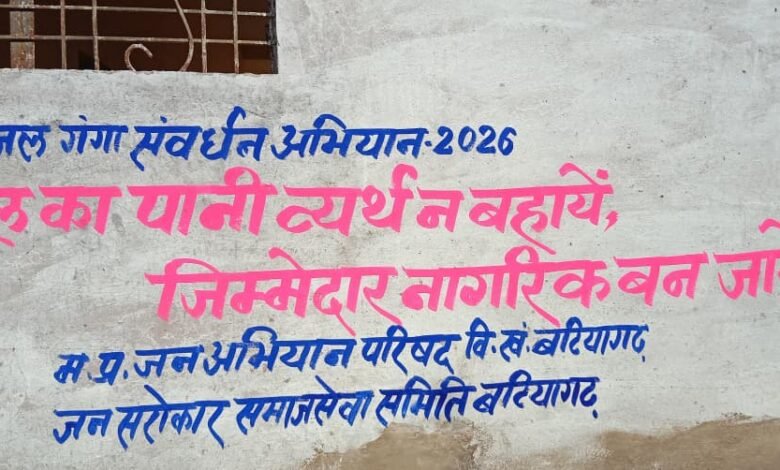 दमोह : मध्यप्रदेश जन अभियान परिषद के मार्गदर्शन में संचालित जल गंगा संवर्धन अभियान के अंतर्गत नवांकुर संस्था जन सरोकार समाजसेवी समिति, बटियागढ़ द्वारा जल संरक्षण के प्रति जन-जागरूकता बढ़ाने हेतु दीवार लेखन (Wall Writing) का कार्य किया गया। इस रचनात्मक पहल के माध्यम से आमजन को यह संदेश दिया गया “जल है तो कल है, जल बचाएं-जीवन बचाएं।